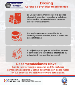 Es una práctica maliciosa que consiste en buscar, recopilar y divulgar públicamente información personal o privada de una persona sin su consentimiento, generalmente con la intención de dañar su reputación, intimidarla o ponerla en riesgo.