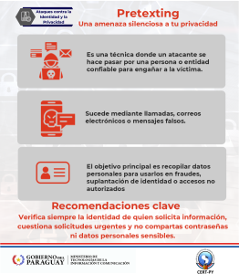 Es una técnica de ingeniería social que consiste en inventar una historia o “pretexto” creíble para engañar a una persona y obtener información confidencial, acceso a sistemas o realizar acciones que beneficien al atacante.