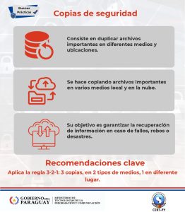 Es una duplicación de los datos importantes documentos, bases de datos, correos, configuraciones, etc, que se almacena en un medio seguro (disco externo, servidor, nube, etc.) para poder recuperarlos en caso de pérdida, daño o ataque.