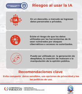 El uso de la inteligencia artificial implica ciertos riesgos, como la difusión de información errónea, la pérdida de privacidad, sesgos en los resultados y una posible dependencia excesiva de sistemas automatizados.