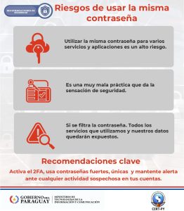 Utilizar la misma contraseña en diferentes plataformas aumenta el riesgo de sufrir accesos no autorizados. Si una cuenta es vulnerada, los atacantes pueden acceder fácilmente a las demás. Esto compromete datos personales, financieros y laborales.