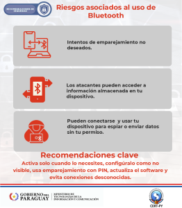 El uso de Bluetooth, aunque práctico, puede representar un riesgo para la seguridad de la información. Si está activado de forma permanente o en espacios públicos, puede ser vulnerable a accesos no autorizados, robo de datos, malware o rastreo.