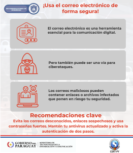 El correo electrónico es una herramienta clave, pero también una vía común para ataques informáticos. Para usarlo de forma segura, evitá abrir enlaces o archivos sospechosos, verificá siempre el remitente, y no compartas información confidencial por este medio.